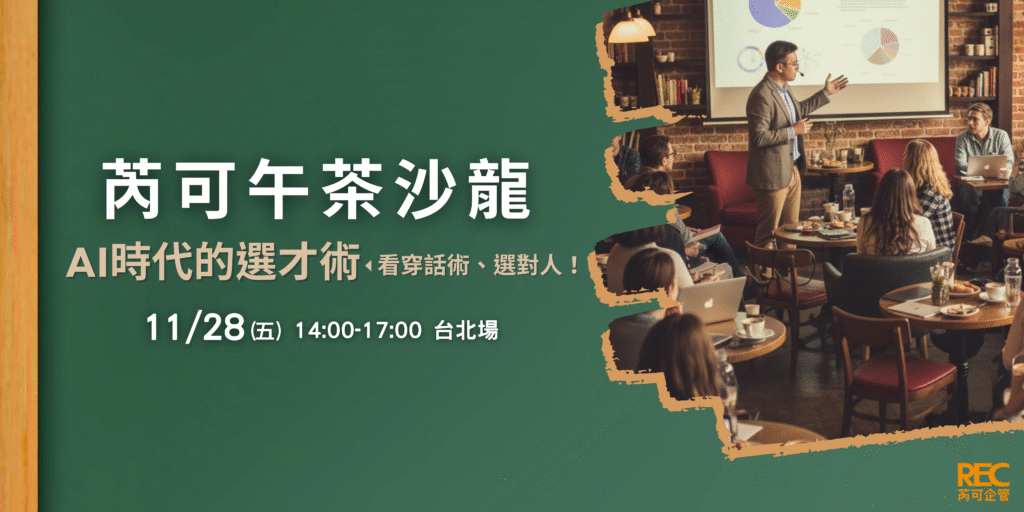 12/12 台南,芮可午茶沙龍 — AI 時代的選才術:看穿話術、選對人才。南臺灣的 HR 與主管也能親身體驗 BEI/STAR 結構化面談、職能導向選才邏輯與 AI 陪練工具。限量席次,立即報名!