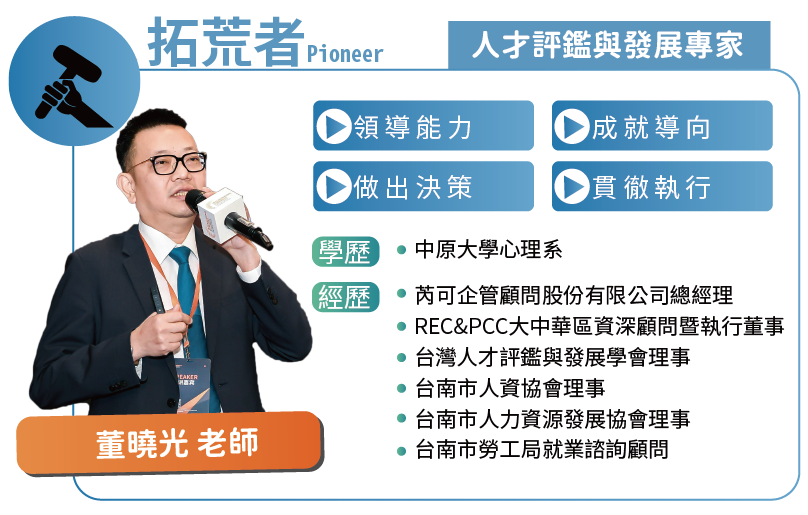 「人才評鑑與發展」整合職能模型、評鑑工具、培訓資源與發展機制,協助企業從選才、育才到用才,建構一條清晰且具策略性的發展路徑,讓人才成為組織永續前行的核心動能。