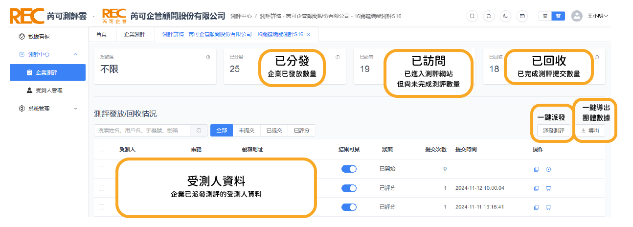 功能介紹 Home > 芮可測評雲 > 功能介紹 快速上手、彈性操作 為企業打造高效測評體驗 提供企業從測驗建立、受測管理、結果分析到報表輸出的一站式解決方案,全面提升人才管理效率。 自由設定測驗 彈性選擇測驗類型與受測對象 一鍵發送邀請 支援Email快速發送追蹤回覆狀況 即時進度追蹤 數據每分鐘更新即時更新作答狀況 系統化結果解析 圖表化呈現重點清晰 批量管理測評 靈活設定受測對象一次安排多種測評 數據驅動人才決策 讓用人更有依據 整合多份測驗數據,提供可視化報表與對比工具,協助企業進行選才、發展、留才等關鍵判斷。 多維度圖表分析 橫向比較長期追蹤 標準化報表輸出 支援PDFExcel格式 支援個人/團隊分析 洞察員工能力潛力與適配性 基本資安防護 全天候防火牆與存取管理保障測評資料安全 友善用戶設計 無須下載或安裝軟體,輕鬆上網即可操作與管理,從HR到部門主管,皆能快速上手並順利推動測評任務。 清晰操作介面 與簡易流程 手機與電腦皆可作答 提升受測便利性 支援多語系顯示 (繁體中文、簡體中文) 立即加入 體驗數據帶來的管理革新 歡迎預約諮詢或參與產品體驗,探索更多應用場景與企業成功案例。 立即體驗芮可測評雲